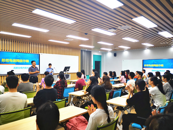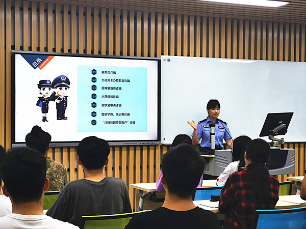 宣讲团成员章婷警官以“如何防范电信网络诈骗”为题,给师生做安全教育讲座,她从“刷单类诈骗”“办信用卡办贷款类诈骗”“游戏装备类诈骗”“木马链接诈骗”等七个常见诈骗类型入手,结合生动详实的案例,仔细分析了每类电信网络诈骗的主要特点和行骗手法,并针对每种诈骗类型提出了防范策略。宣讲活动旨以点带面,充分发挥学校安全保卫专干和治保委员的辐射作用,向全校师生普及防范电信网络诈骗的知识和技巧,为创建平安高校、构建安全和谐美丽校园奠定坚实基础。