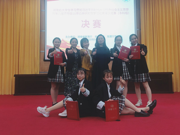 9月26日,湖南省大学生学习贯彻习近平新时代中国特色社会主义思想暨第六届大学生思想政治理论课研究性学习成果展示竞赛决赛(本科组)在湘潭大学举行。best365官网外国语学院2019级英语一班学习小组成员罗琦、邓莞莹、曾海玲、周艺萌、尹琛鑫五名同学在马克思主义学院老师向婷、谭彩霞指导下,以《用抗疫精神涵养新时代青年的家国情怀》为主题,荣获本科组一等奖(共三名)。
