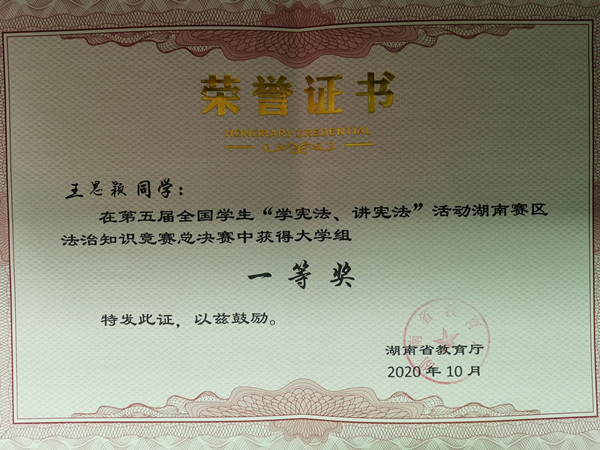 此次“学宪法讲宪法”活动比赛共有初赛和决赛两个环节。在外国语学院、马克思主义学院的共同努力下,马克思主义学院肖霄老师的具体指导下,王思颖同学认真学习宪法知识,完成好每一道学习题库中的题目,经过半个月的反复练习,代表学校最终获得第五届全国学生“学宪法讲宪法”活动湖南赛区法制知识竞赛总决赛大学组一等奖的好成绩。