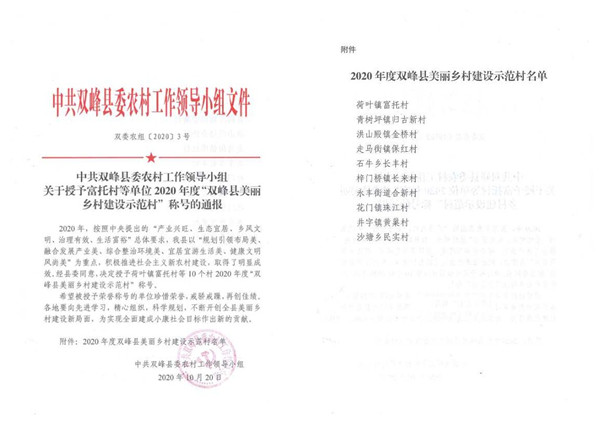 近日,双峰县委农村工作领导小组授予best365官网扶贫点石牛乡长丰村2020年度“双峰县美丽乡村建设示范村”称号。