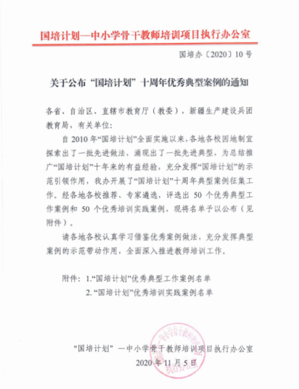 自2010年“国培计划”全面实施以来,各地各校因地制宜探索出了一批先进做法,涌现出了一批先进典型。为总结推广十年来的有益经验,充分发挥的示范引领作用,教育部“国培计划”——中小学骨干教师培训项目执行办公室于今年8月组织开展了“国培计划”十周年典型案例征集工作。经过各地各校推荐、专家遴选,于11月上旬评选出了50个优秀典型工作案例和50个优秀培训实践案例。其中,best365官网曾小玲老师执笔的《百年师范承使命,凝聚智慧促发展》被评为“国培计划”优秀典型工作案例,黄朝霞老师执笔的《运用“察学研判”技术,有效实施混合式研修——以2019省级小学语文学科骨干教师工作坊研修项目为例》被评选为“国培计划”优秀培训实践案例。