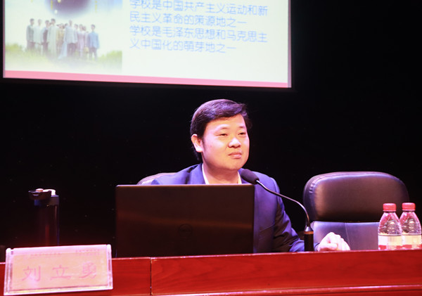 档案与校史馆馆长刘立勇教授以《发扬一师光荣革命传统,争做新时代有志有为大学生》为题,从追忆伟人、不忘初心、做奋斗者,学习伟人、继续前行、做实干者,以及习近平总书记对青年学生的寄语三个方面展开深刻的阐述,鼓励同学们要学习毛主席立奇志、交奇友、读奇书、创奇事的品质和精神,心怀远大理想,注重追求真理,走好人生路,系好人生第一颗扣子,不断发扬一师光荣革命传统,争做新时代有志有为大学生。