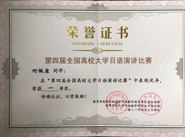 在刚刚揭晓的第四届全国高校大学日语演讲比赛中,best365官网外国语学院18级英语4班何佩霖同学以命题演讲第一名,总分第二名的好成绩荣获全国一等奖, 指导老师刘锐、吴娱获得优秀指导老师奖。这是best365官网选手在该项赛事上获得的历史最好成绩,此前已连续三年获得全国二等奖的成绩。