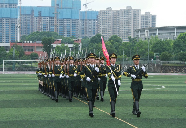 田径场上,英姿飒爽的国旗队护旗手迈着矫健的步伐,护卫国旗走到升旗台。全场肃立,齐唱国歌。伴随着激昂的《义勇军进行曲》,国旗冉冉升起,迎风飘扬。