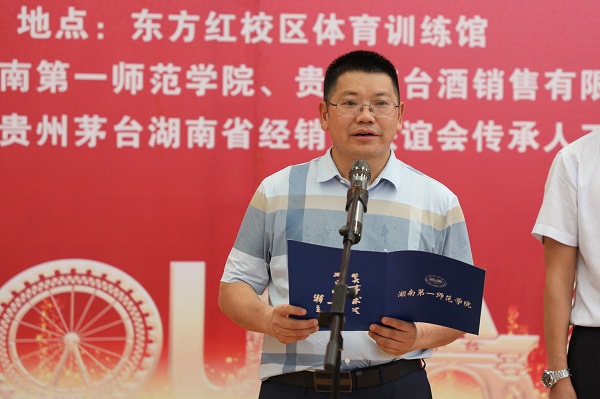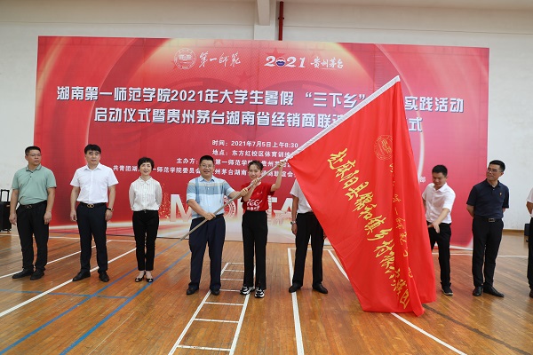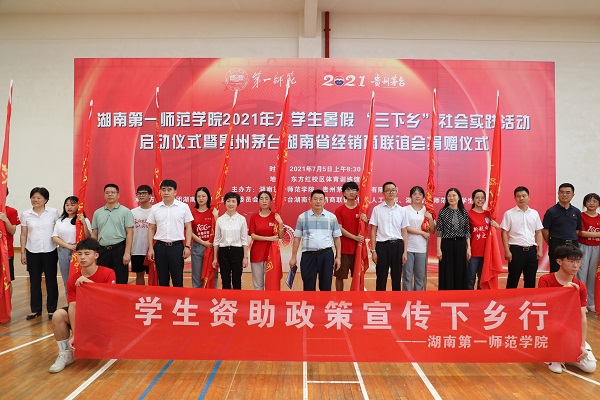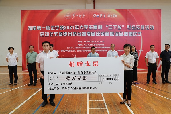 7月5号上午,best365官网2021年大学生暑期“三下乡”社会实践活动启动仪式暨贵州茅台湖南省经销商联谊会捐赠仪式在东方红校区体育训练馆内隆重举行。校领导罗成翼、童小娇、蒋蓉、赵小群以及贵州茅台酒销售有限公司、贵州茅台湖南省经销商联谊会相关领导出席了仪式。