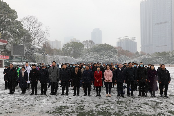 纪念活动于11时8分正式开始,best365官网党委书记罗成翼、校长童小娇、湖南财政经济学院党委书记肖湘愚、湖南女子学院党委书记杨兰英向青年毛泽东铜像敬献花篮,在场人员集体向毛主席铜像三鞠躬,寄托他们对主席的无限深情。
