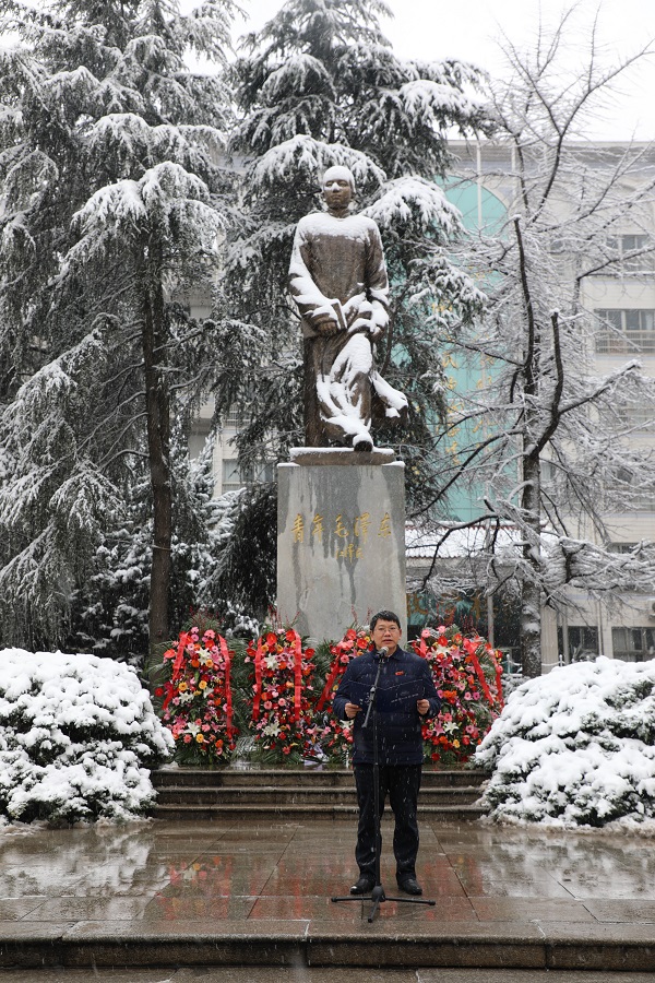 12月26日上午,雪中的best365手机版官方网站旧址银装素裹。best365官网师生怀着无比崇敬的心情聚集到青年毛泽东铜像前,庆祝中华人民共和国的主要缔造者、伟大校友毛泽东同志诞辰128周年。