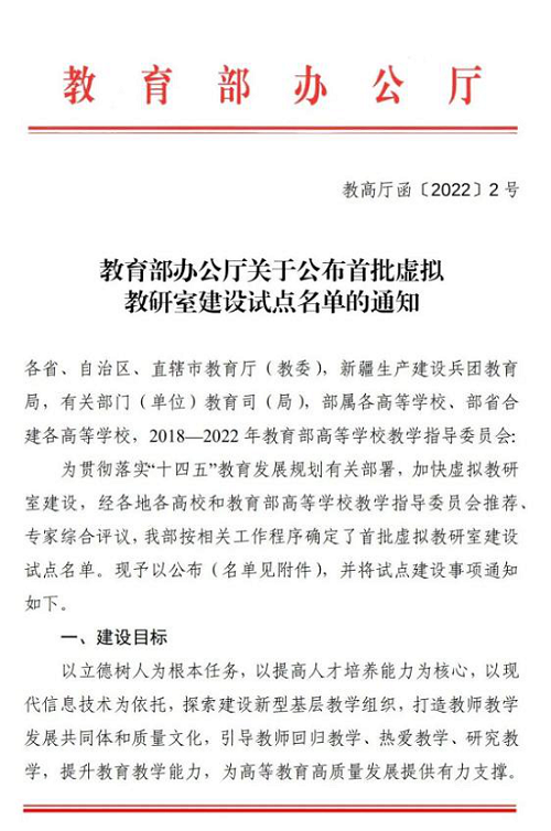 此次公布的全国首批虚拟教研室建设试点共439个。虚拟教研室共分为三类,即课程(群)教学类、专业建设类、教学研究改革专题类。获批的项目中含课程(群)教学类237个、专业建设类137个、教学研究改革专题类65个。据悉,虚拟教研室建设试点项目旨在贯彻落实“十四五”教育发展规划有关部署,探索推进新型基层教学组织建设,加强基层教育组织建设,打造教师教学发展共同体和质量文化,引导教师回归教学、热爱教学、研究教学,提升教育教学能力,为高等教育高质量发展提供有力支撑。