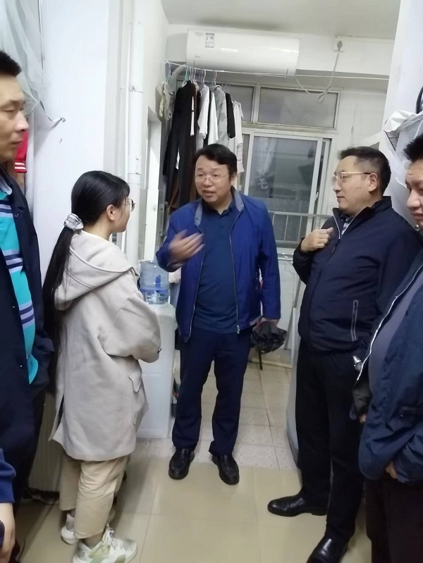 彭晓辉一行重点走访看望了受汛情影响严重的6栋和7栋学生公寓的同学们。每到一处宿舍,彭晓辉都悉心问候驻守学生公寓的辅导员,细心询问同学们的学习生活状况,详细了解他们对学校的愿望需求,充分肯定了同学们在恶劣天气下仍能遵守学校规章制度,认真学习,积极乐观对待雨水之扰的优秀表现。当来到6栋714宿舍和7栋740宿舍,看到屋顶、墙面、床上、地面仍然残留的水渍、掉块、沙袋时,彭晓辉动情地说:“看到这次涝后场景,想起相关职能部门拍摄的视频和照片,我能强烈地感受到当时情况的紧急;而现在,你们不但没有怨言,而且相当理性、非常理解和支持学校,在尴尬困窘的环境中乐观自律、刻苦学习,令我感动和欣慰!今天,我受罗书记和童校长的嘱托来看望你们,希望你们以‘刻苦学习’为‘天职’,以‘健康成长’为‘己任’,不断锻造提升自己!学校将想办法尽力为你们改善学习生活环境和条件,为你们搞好生活后勤服务,让你们学习无后顾之忧,生活无尴尬烦恼,在快乐学习中健康成长!”
