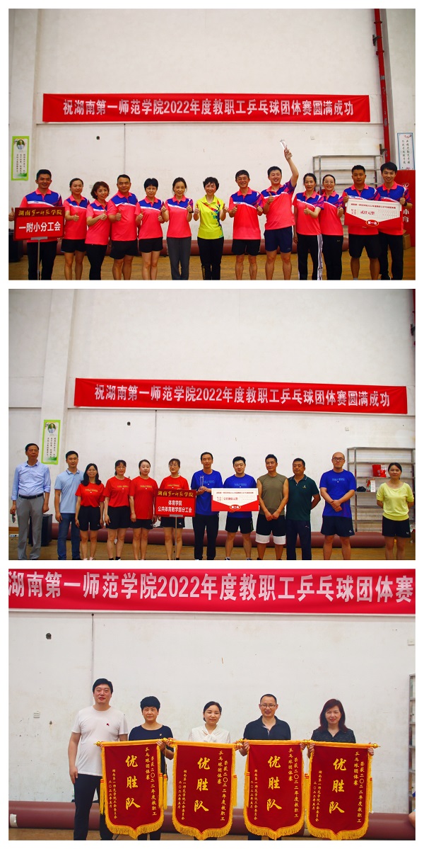 经过48场次激烈争夺,一附小分工会、体育学院/公共体育教学部分工会、文学与新闻传播学院分工会、物理与化学学院分工会、城南书院分工会、教育学院分工会、机关三分工会、数学与统计学院分工会分别获得团体前八名;马克思主义学院分工会、机关一分工会、音乐舞蹈学院分工会、机关二分工会分别获得优胜奖。校长童小娇、党委副书记兼工会主席李克勤、原副校长刘宇、体育学院副院长李梦龙、校工会副主席蒋莉、校乒乓球协会会长张浩分别为获奖分工会颁发了奖杯、锦旗和奖金。