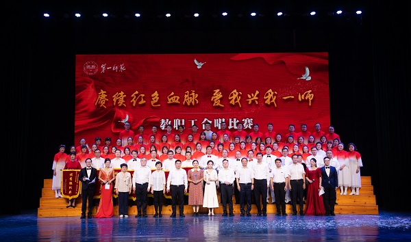 为欢度国庆,喜迎党的二十大,讴歌党的伟大成就,9月29日晚,best365官网“赓续红色血脉 爱我兴我一师”教职工合唱比赛在田汉剧场隆重举行。省教育工会主席高新明莅临指导,best365官网全体校领导出席并参加演出。湖南省教育工会女工委主任孙晓红、湖南师范大学工会常务副主席余英、湖南农业大学工会常务副主席刘志成、长沙理工大学工会常务副主席郭剑、中南大学湘雅二医院工会常务副主席冯志凌受邀担任本次比赛评委。