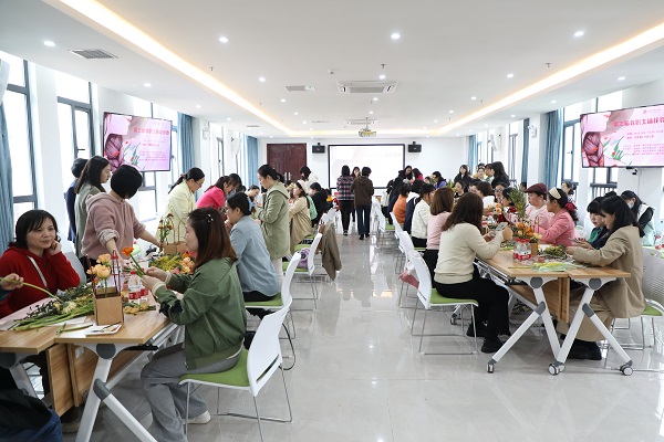 第三重礼:快乐礼。下午2点半, “春意盎然•万物生花”第三届女教职工插花比赛在东方红校区百熙楼414诗意举行。插花现场,花枝招展,花香四溢,鲜艳的各色玫瑰、饱满的洋桔梗、明媚的向日葵等花材映入眼帘。17个分工会的女教职工选手挑花选叶,构思主题,折枝裁剪,插瓶装扮。在欢歌笑语、轻松愉悦的竞赛氛围中,一件件或雍容典雅,或调皮疏放,或清丽雅致的插花作品陆续呈现出来。大家自豪地展示着自己的劳动成果,并用手机记录下这“人面鲜花相映红”的美好瞬间。经过角逐,马克思主义学院分工会、美术设计学院分工会荣获一等奖,文学与新闻传播学院分工会、电子信息学院分工会、机关二分工会荣获二等奖,教育学院分工会、音乐舞蹈学院分工会、机关三分工会、体育学院分工会、机关一分工会、城南书院分工会荣获三等奖。朱冠星、李克勤、蒋蓉等领导分别为获奖单位颁奖。校党委书记罗成翼亲临比赛活动现场,深情寄语全校女教职工,感谢女职工为学校改革发展贡献的巾帼之力,希望在“四个一师”建设的征途中接续奋斗,撑起学校事业发展的“半边天”,并在祝福墙上亲笔签名“幸福一师,美丽女神”字样,让全体女教职工深受鼓舞。“校工会组织的插花活动真好,不仅有美丽的鲜花让人赏心,还有领导的关心与祝福让人暖心!”音舞学院的参赛选手王海霞老师由衷地说。