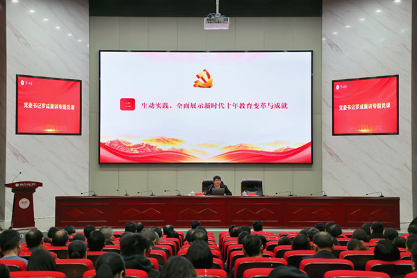 罗成翼强调,习近平总书记关于教育的重要论述,博大精深、系统全面,科学回答了事关教育的根本性、全局性、战略性问题,是思想深邃、内涵丰富、特色鲜明的“中国教育学”,是习近平新时代中国特色社会主义思想的重要组成部分,为我们做好工作指明了方向、提供了根本遵循。我们要高举习近平新时代中国特色社会主义思想伟大旗帜,肩负起新时代为党育人、为国育才的使命,走好新时代一师高质量快发展之路,为服务“三高四新”和“强省会”战略,建设现代化新湖南作出更大贡献。