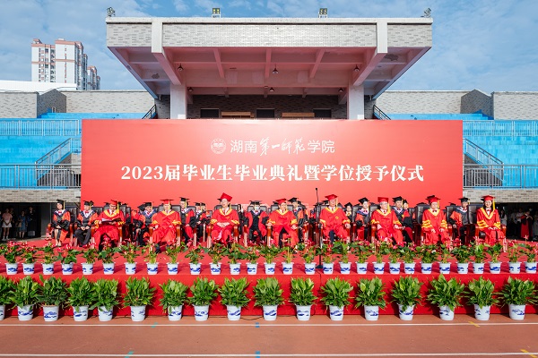校党委书记罗成翼主持典礼,党委副书记、校长胡穗致毕业贺词,全体在家校领导、主礼教授、教师代表、家长代表与全体毕业生参加典礼。