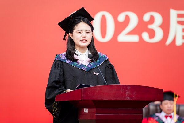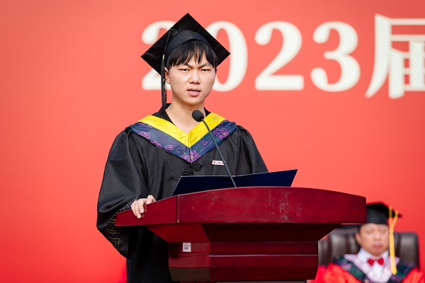 计算机学院杨恒伏教授作为教师代表发言。2019级科学教育专业2班何思楠和2019级电子信息工程专业段新利同学作为优秀毕业生代表发言。
