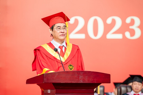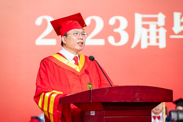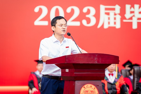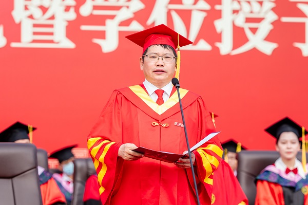 罗成翼在主持典礼时勉励全体毕业生,要牢记习近平总书记的嘱托,铭记“要做人民的先生,先做人民的学生”的校训,践行“实事求是,不自以为是”的校风,传承“学思并进、知行合一”的学风,争做时代好青年,用青春与汗水为新时代、新征程贡献力量,书写青春最绚丽的篇章,为母校争光添彩。