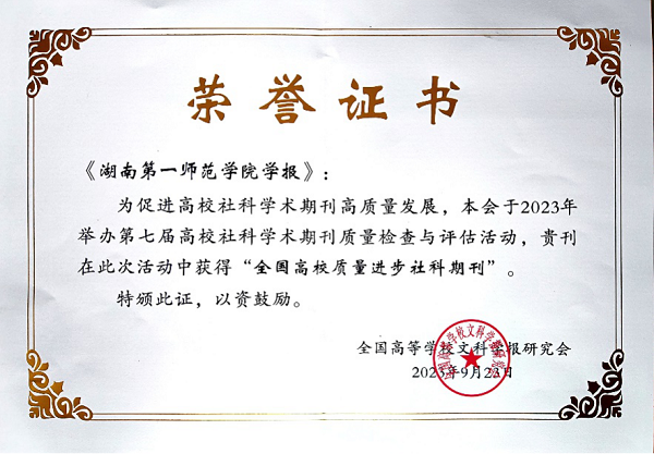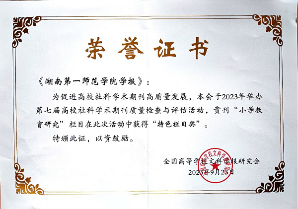 近几年,best365官网学报的影响力、社会认可度不断增强。2019-2022年,学报三次获得湖南省期刊社会效益考核优秀等级,2021年被湖南省委宣传部立项为湖南省“品牌社科期刊”,“小学教育”栏目被湖南省教育厅立项为“品牌栏目”。2020年度学报复合影响因子上升幅度达32%、2022年影响力指数(CI)提升幅度为37%。“毛泽东思想与马克思主义中国化时代化研究”栏目,吸引了北京大学博雅讲席教授顾海良、清华大学特聘教授李捷、肖贵清等20多位知名学者发表学术论文;“小学教育研究”栏目发文作者大部分来自北京师范大学、首都师范大学、华东师范大学等全国重点师范院校。