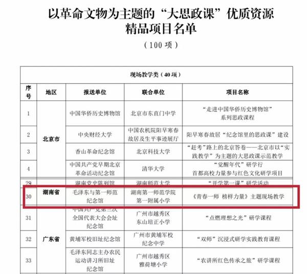 作为首批全国“大思政课”实践教学基地,“毛泽东与第一师范”纪念馆依托基地优势,深挖红色资源,革新教学体系,深化学术研究,并联合毛泽东青年时期曾任主事的第一师范附小,打造了创新型教育实践项目“青春一师榜样力量”主题现场教学。项目以青年毛泽东等青春榜样的故事为素材,打造了一系列赓续红色基因、传承榜样力量的现场教学课程,用心用情讲好一师故事,使“思政小课堂”和“社会大课堂”紧密衔接,广获好评。