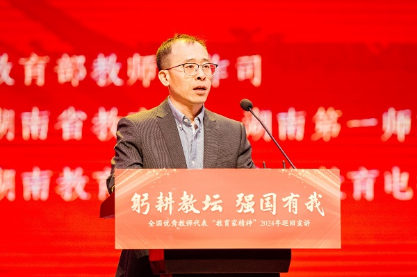 郭建国代表湖南省委教育工委、湖南省教育厅致辞,对宣讲团的到来表示热烈欢迎和诚挚敬意。他希望全省教师向6位优秀老师看齐,以榜样为“镜”,汲取奋进之力,进一步深刻领会教育家精神的精髓要义与价值内核,深刻认识教育的政治属性、战略属性、民生属性,珍惜教师荣誉,把传道授业、教书育人和自我修养结合起来,坚持做到尊师道,将教育家精神内化为人生价值的自觉追求和行动指南;明师德,以教育家精神引领教育理念更新,促进自身专业成长;为师范,把教育家精神外化为躬耕三尺讲台的具体行动,积极投身教育强省建设的生动实践,真正成为教育家精神的传播者和实践者。
