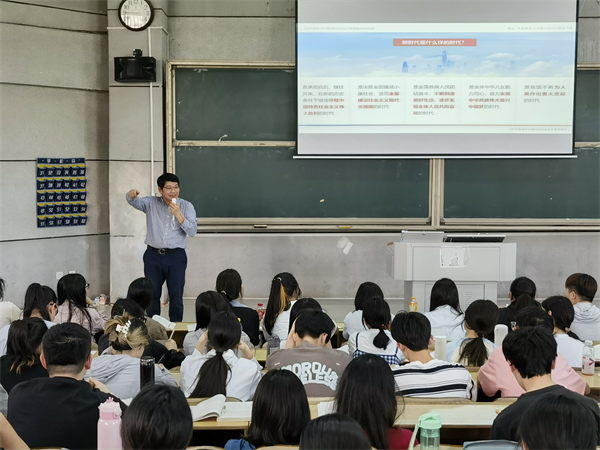 罗成翼主讲了《习近平新时代中国特色社会主义思想概论》导论部分。他以5月11日习近平总书记在新时代学校思政课建设推进会上的重要指示作为课程导入,从历史定位、创立历程和内容体系三个方面阐述习近平新时代中国特色社会主义思想,重点讲解了习近平新时代中国特色社会主义思想回答的三个重大时代课题。罗成翼结合当今国内外政治局势、毛泽东与第一师范的红色故事,从时代背景、历史方位、实践基础、必由之路四个维度娓娓道来,深刻阐释了“新时代孕育新思想”,时代是思想之母,实践是理论之源的道理。