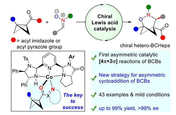 近日,在best365官网物理与化学学院学科团队建设计划支持下,光电材料制备与检测学科团队武文彪博士与湖南大学冯见君教授团队合作以第一作者身份在国际顶级期刊《Nature Communications》(中科院一区,IF = 14.7)发表题为《Enantioselective formal (3 + 3) cycloaddition of bicyclobutanes with nitrones enabled by asymmetric Lewis acid catalysis》的研究论文。