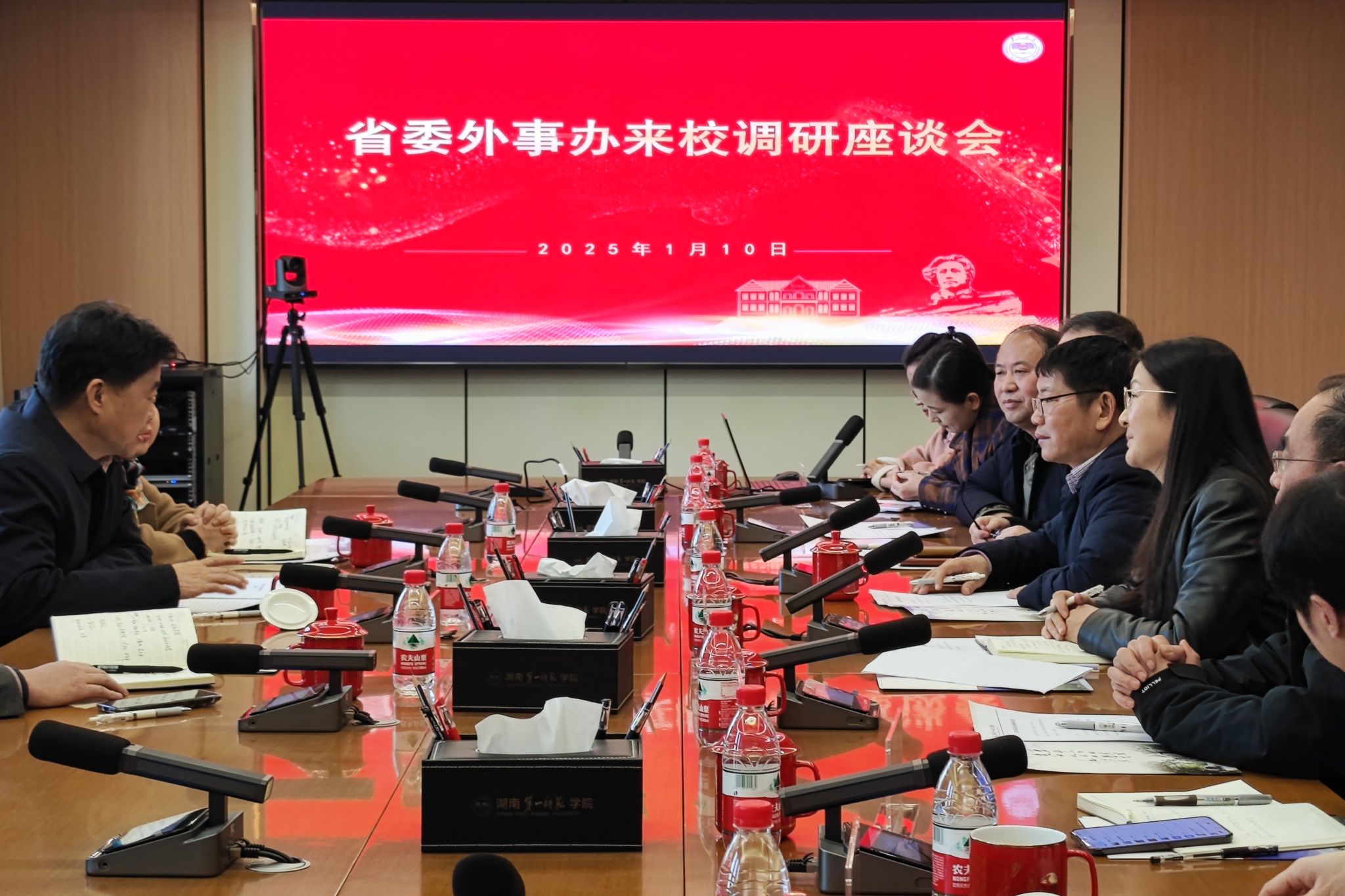 1月10日下午,中共湖南省委外事办一级巡视员邱爱华一行莅临best365官网,就书院文化传播工作开展调研。调研座谈会在百熙楼710会议室召开。校党委书记罗成翼,校党委委员、副校长蒋蓉出席会议。外国语学院、文学与新闻传播学院、音乐舞蹈学院、美术与设计学院、初等教育学院等相关部门负责人参加会议。会议由蒋蓉主持。