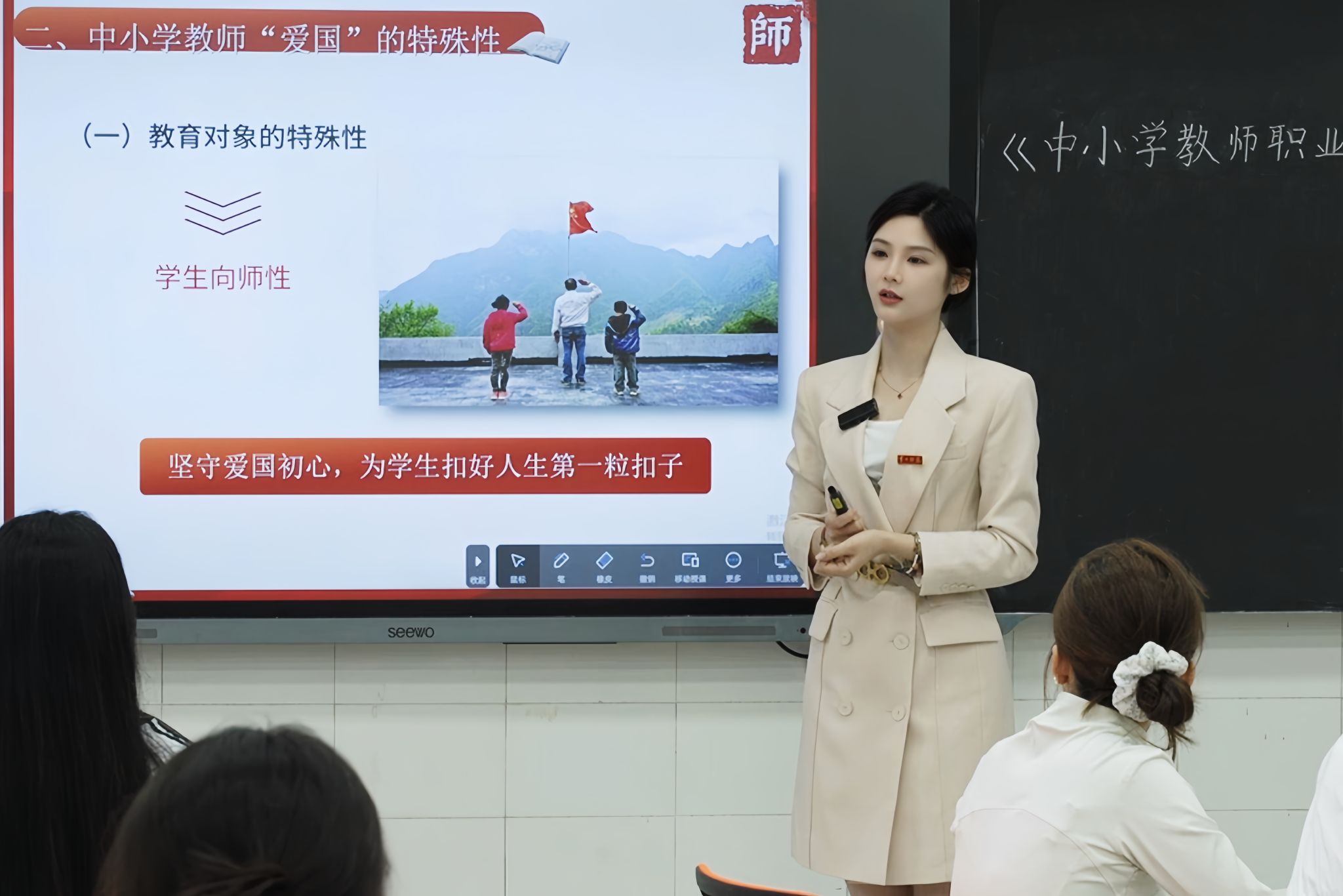 “课堂不仅是知识的殿堂,更是思想与价值的熔炉。”黄蓝紫老师主讲《教育政策与法律法规》《教育政策法规与教师职业道德》《教育学原理》等师范生必修课,作为“培养教师的教师”,她深知责任重大,始终坚守“立师德,育栋梁”这一教学信条。