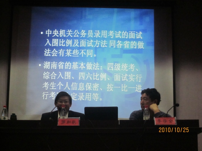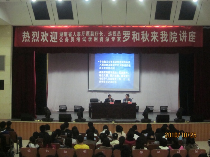 2010年10月25日下午,省人事厅原副厅长、公务员考试录用资深专家罗和秋巡视员应院团委的邀请,在东方红校区科技楼演播厅为我院学生做了题为“如何报考、备考公务员”的专题讲座。讲座由副院长李学全主持,院团委书记任晓晴、副书记罗祥云等出席了讲座,来自全院各系部的300余名学生代表参加了此次活动。