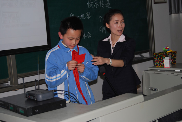 接下来是小学高级教师张蕾老师(我院98级小教大专班毕业生)执教的五年级习作课——《快乐传递》。“传,快传,快传……”伴着紧促的音乐声,一只覆盖着毛巾的篮子在小学生中间传递着。紧张、兴奋、好奇……快乐在整个教室中洋溢。一下子,全体学生的注意力都被凝聚在这个“快乐传递”的游戏中。紧接着张老师引导学生观察游戏活动中同学的表情,言行,揣摩他们的心理,启发学生“留心观察、用心体会”,直至具体行文。本来枯燥抽象的作文指导通过轻松快乐的游戏渗透与传递到了每个学生的认识之中,寓教于乐在妙合无垠中得完成。