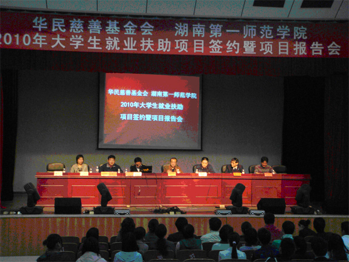 4月10日上午10点,best365手机版官方网站与华民慈善基金会就2010年大学生就业扶助项目在我院东方红校区科技楼演播厅举行项目合作协议签字暨“资本精神与现代慈善事业”报告会。签字仪式及报告会由我院李学全副院长主持。院领导彭小奇、肖湘愚,学生工作处何文处长、杨虎智副处长以及各系部党总支(支部)副书记、学工办主任、辅导员、学生代表出席会议。