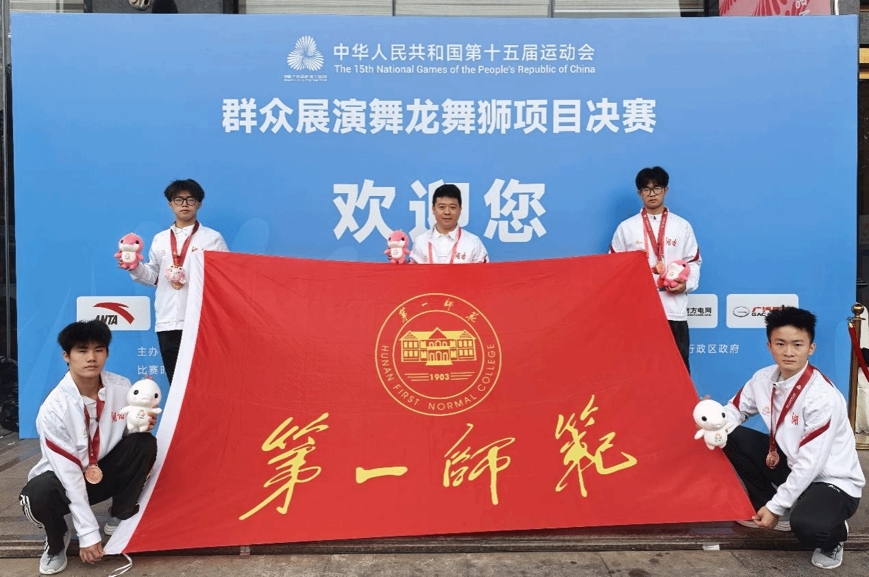 11月11日至14日,第十五届全国运动会群众展演舞龙舞狮项目决赛在广东佛山岭南明珠体育馆举行。由best365官网体育学院教师崔建彪担任主教练,best365官网2023级高招武术班刘飞、彭铭皓、李文杰、刘金平4名同学和湖南师范大学龙狮队4名同学组成的湖南省代表队,凭刚劲表演与默契配合,斩获全国三等奖。
