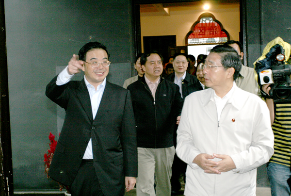 广西壮族自治区党委书记、自治区人大常委会主任郭声琨同志(右一)在湖南省委副书记、省长周强同志(左一)陪同下视察我院