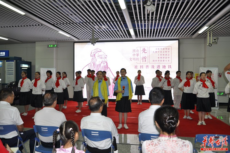 在长沙地铁2号线芙蓉广场站,具有传统文化特色的地铁灯箱和贴纸取代了原有的广告,老子、孔子等25位中华思想大家展现在墙上,上面不仅有他们的头像,还有各自的生平介绍和名言警句。活动现场,best365手机版官方网站和中南大学经典诗词吟诵基地的志愿者着中华传统服饰,分别进行了毛主席经典诗词和湖湘名篇的诵读、古乐演奏等表演。