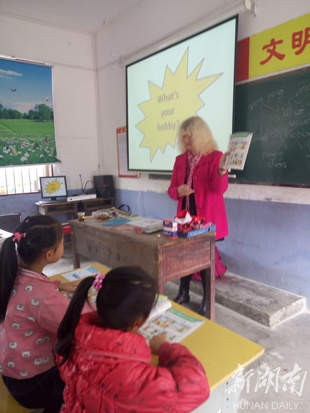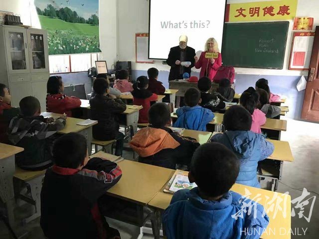 Robert和妻子Ruth早晨7点多就从长沙赶到了白泥学校,他们给五年级和三年级的同学上了口语课。
