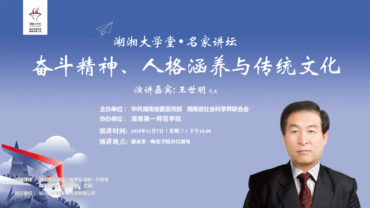 湖湘大学堂将于2018年11月7日下午,邀请全国政协文化文史和学习委员会副主任王世明先生主讲湖湘大学堂·名家讲坛,具体方案如下:
