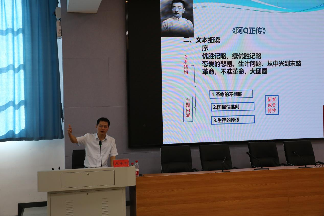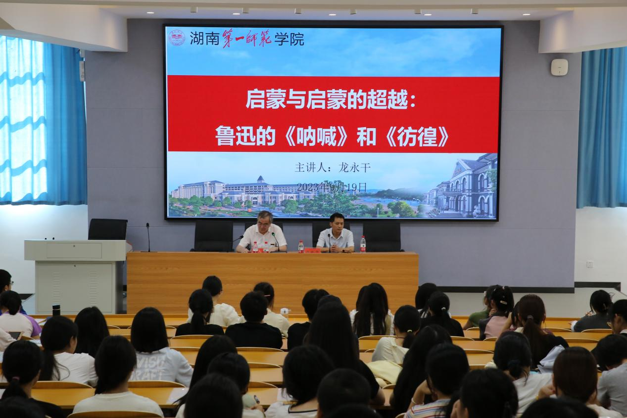 2023年9月19下午,“一师先生”讲坛第四期讲座于玉衡南101举行,文学与新闻传播学院院长龙永干教授应邀作题为“启蒙与启蒙的超越:鲁迅的《呐喊》和《彷徨》”学术讲座。校党委委员、副校长曹兴教授莅临指导并主持讲座,文学与新闻传播学院200余名师生参与了此次活动。