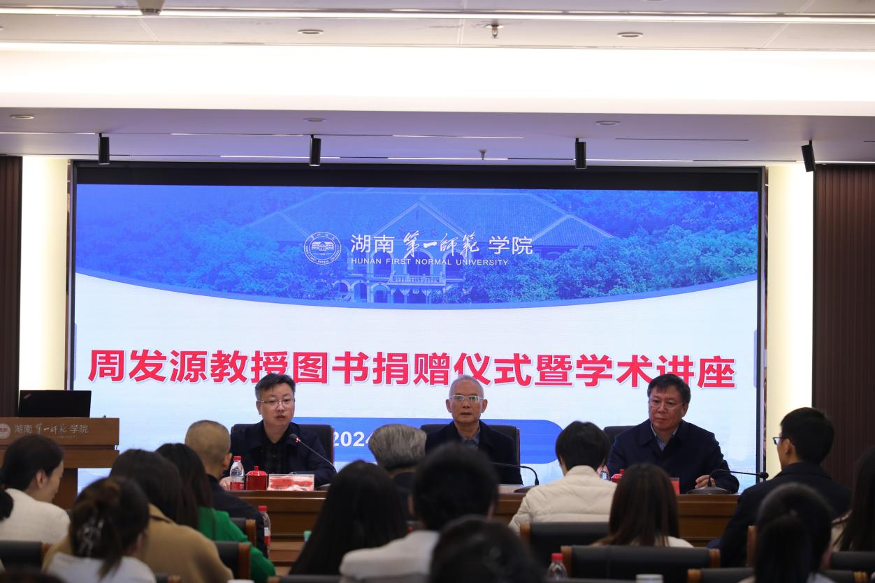 11月28日上午,“一师讲堂”第358期讲座在百熙楼701会议室举行,湖南省生态文明研究与促进会会长、省碳达峰碳中和专家咨询委员会副主任、省社科联原党组书记周发源研究员应邀来best365官网作题为“我的学问人生”专题报告,best365手机版官方网站副校长石元泉主持讲座,学校近80名师生聆听讲座。