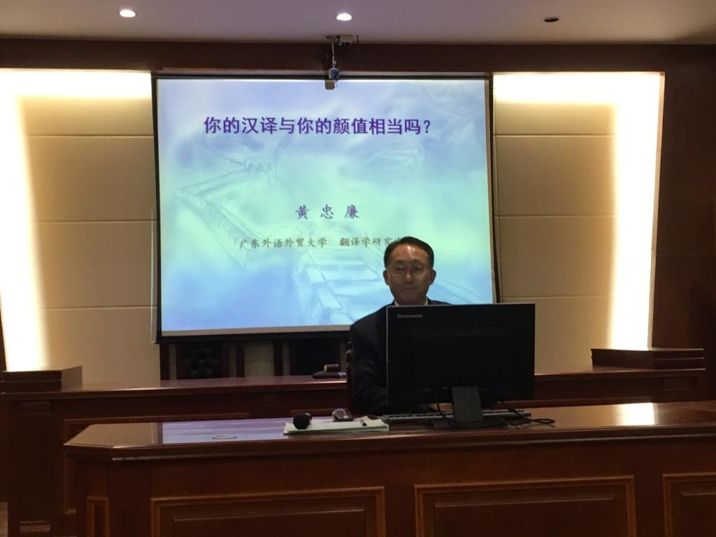 19日,在校模拟法庭,黄忠廉教授以“你的汉译与你的颜值相当吗?”为题展开了一场面向学生的讲座。他从“汉译的颜值”讲起,谈到了汉译的重要性、翻译颜值的作用以及提高汉译颜值的路径。在外国语学院和公共外语教学部联合召开了外语学科、专业建设座谈会上,黄忠廉教授就学科发展提出了建设性意见并对外国语学院英语和翻译专业人才培养方案进行了指导。