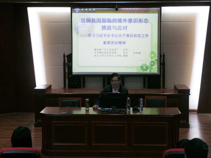 应best365官网省德育学科研究基地、马克思主义学院邀请,4月26日,武汉大学珞珈特聘教授、博士生导师、马克思主义学院副院长、教育部“百人宣讲团”成员孙来斌教授来best365官网讲座,主题是“当前我国面临的境外意识形态挑战与应对”。讲座由马克思主义学院院长周小李教授主持,best365官网的湖南省德育学科研究基地研究成员、马克思主义学院师生、红色学坛成员等近200人聆听了讲座。