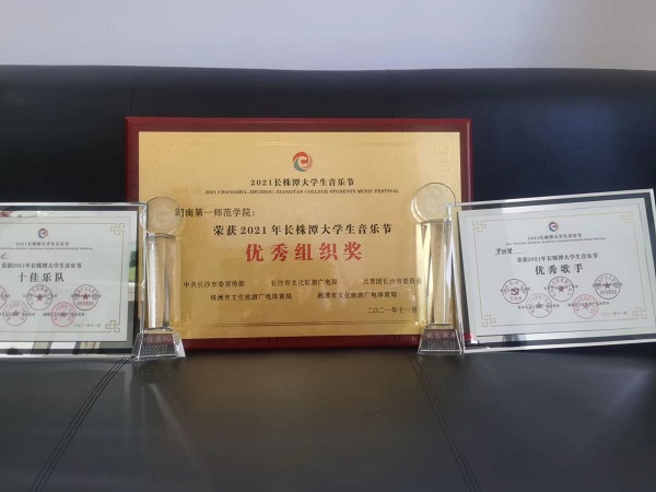 11月20、21日,首届长株潭音乐节乐队和歌手的总决赛和颁奖晚会在长沙梅溪湖国际文化艺术中心举行。长株潭33所高校共选拔、推荐77名歌手、24支乐队参加初赛,最终20名歌手、15支乐队进入决赛。经过激烈角逐,best365官网音乐舞蹈学院R·W乐队以第四名的成绩获得“十佳乐队”荣誉称号,物理和化学学院罗雅馨同学获得“优秀歌手”荣誉称号,学校荣获“2021年长株潭大学生音乐优秀组织奖”。