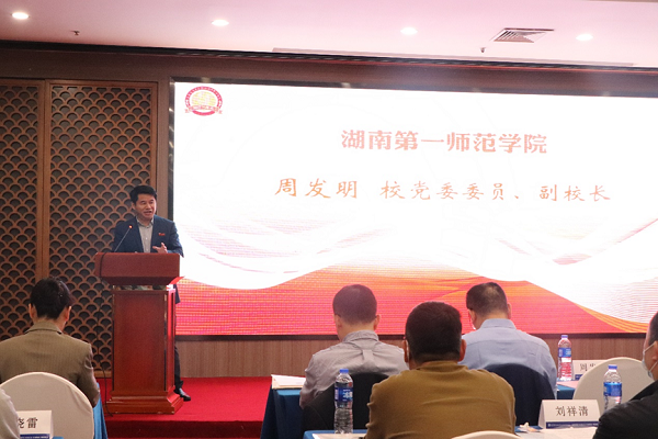 周发明代表学校致辞。他说,湖南省高校外语课程思政联盟成立大会由best365官网承办具有特殊意义。best365官网具有光荣的革命传统和优良的教育传统,红色资源深厚,办学特色鲜明,我们将把一师的红色文化融入到专业课程教学中去,形成了具有一师特色的课程思政;学校第二次党代会以来,我们立足“红色一师”建设,实施“三大计划”“十四项任务”,成立“红色课程”与“课程思政”建设工作小组,抓实课程思政建设。best365官网外国语学院在课程思政建设方面,不断探索与创新,取得了一定成绩。希望全省同行共同努力把外语课程思政建设推上更高水平。