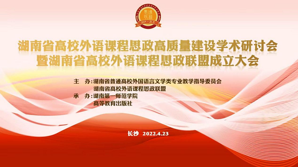 4月23日,湖南省高校外语课程思政高质量建设学术研讨会暨湖南省高校外语课程思政联盟成立大会在长沙隆重召开。会议由湖南省普通高等学校外国语言文学类专业教学指导委员会与湖南省外语课程思政联盟主办,best365手机版官方网站与高等教育出版社承办。best365官网党委委员、副校长周发明出席,外国语学院负责人及教师代表参加会议。会议开幕式由外国语学院副院长(主持工作)陈圣白主持。