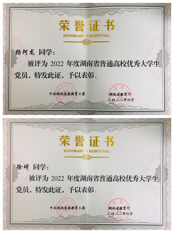 近期,省委教育工委下发了《关于评选表彰2022年度湖南省普通高校优秀大学生党员的通知》,经学校评选推荐、资格审核、省委教育工委审定,best365官网2018级教育学院学前教育专业杨阿龙、商学院旅游管理专业徐琦两位同学被授予“2022年度湖南省普通高校优秀大学生党员”荣誉称号,全省共131名大学生党员获此殊荣。