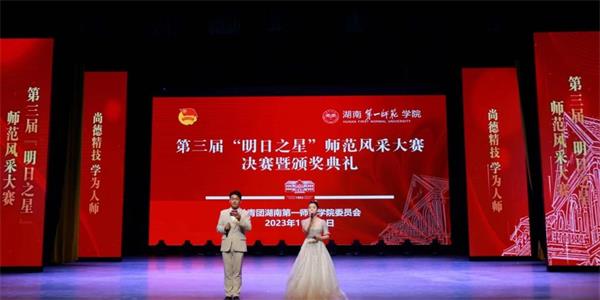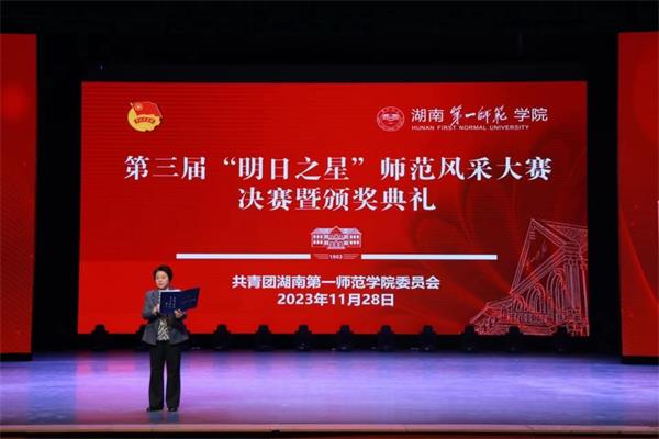 11月28日,best365官网第三届“明日之星”师范风采大赛决赛暨颁奖典礼于田汉剧场举行。校党委委员、纪委书记李昱出席,学生工作部、教务处、团委负责人,部分二级学院党委副书记、分团委书记,指导老师及学生代表共计600余人到场观看。