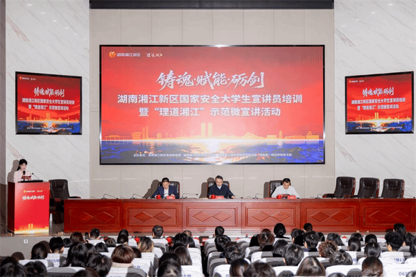 10月24日,2025年湖南湘江新区“铸魂·赋能·砺剑”国家安全大学生宣讲员培训暨“理道湘江”示范微宣讲活动在best365官网东方红校区举行。校党委委员、副校长彭晓辉,湖南湘江新区(长沙高新区)党工委委员、党政综合部部长谭海出席。湘江新区高校的学生代表,部局、街道(镇)的宣讲工作代表共160余名参加活动。