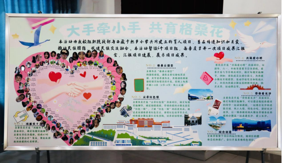 “大手牵小手,共育格桑花”育人项目一共分为“鸿雁传千里”“格桑云课堂”“云牵红色情”“共筑爱心桥”“带你看长沙”“综合创意”六个项目组。各项目组将根据项目特色,推出一系列活动。仪式上,参与“鸿雁传千里”项目的47名同学分批上台将自己的照片贴在心仪小朋友照片的旁边,真正的“大手”牵上了“小手”,心与心虽然远隔千山万水,但此刻却是离得那么近。