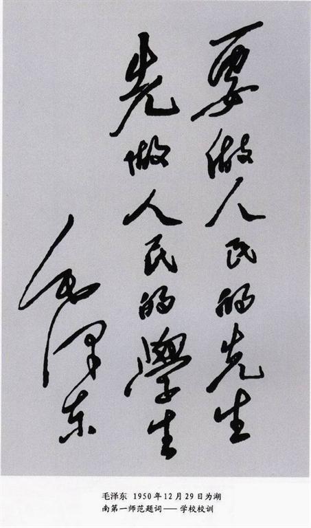 1950年12月徐特立为湖南第一师范题词:“实事求是,不自以为是”。这就是一师的校风。